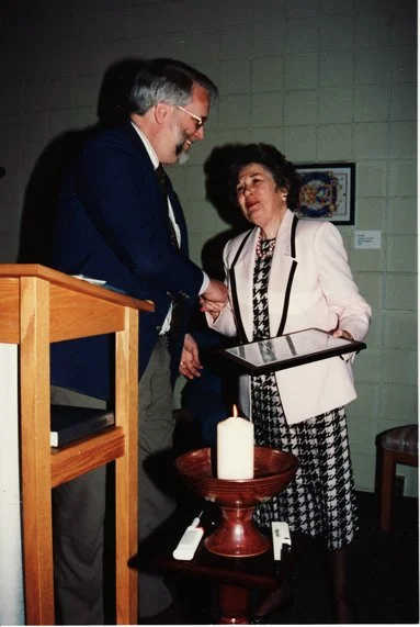 Bob Swanson and Liz Winder on a Easter Sunday circa 1990s. Liz is receiving a Pro Choice Award. (2007.0025)