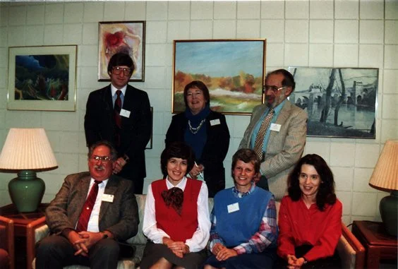 1986 Search Committee: FR: Bill Benallack, Alice Hill, Alice Erickson, Lynn Scott, BR: Jim Smith, Marianne Davis, and Frank Pinner. (2007.0051)